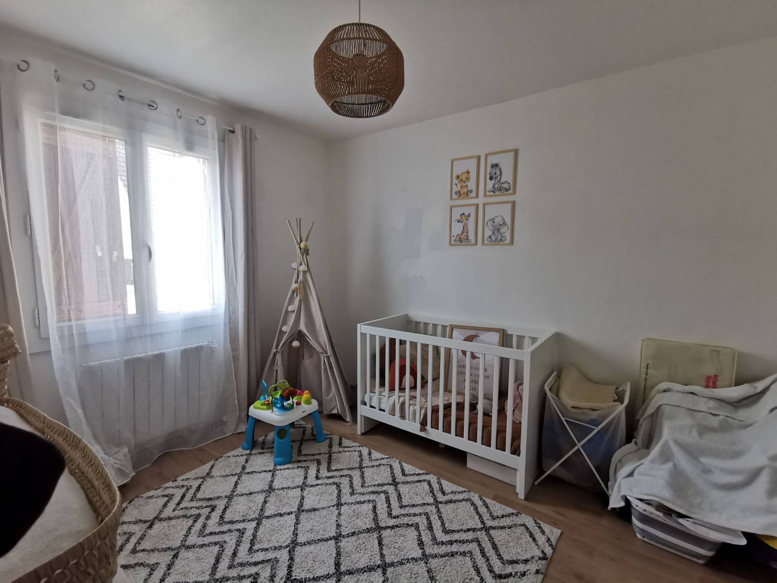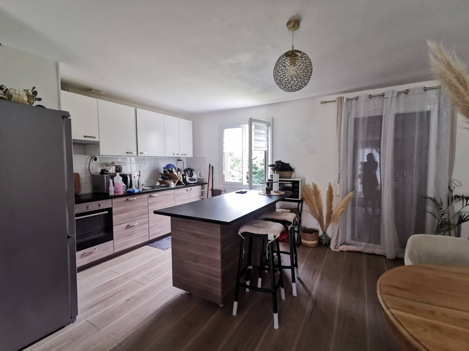 Un grand salon-séjour avec cuisine ouverte aménagée, un couloir desservant un wc indépendant, une salle de bain et 2 chambres. Un garage accolé avec accès direct à la maison. Le tout sur un terrain de 244 m².