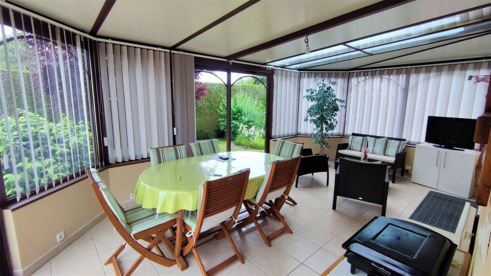 Double garage indépendant avec comble accessible, un atelier, et une véranda attenante à la maison principale d'environ 19m².
