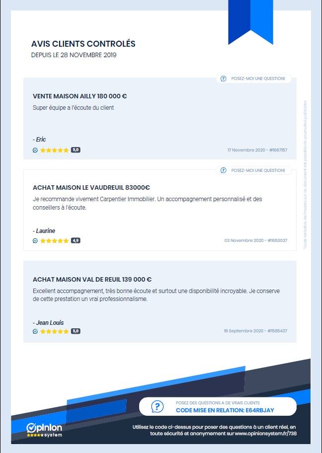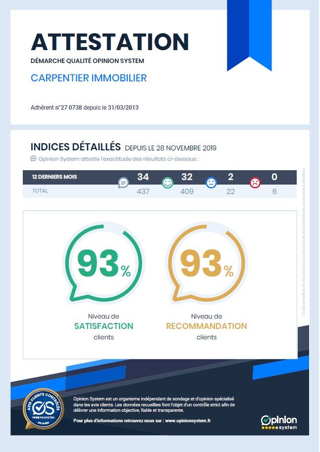 Notre entreprise est adhérente à Opinion System, n°1 des avis clients contrôlés pour professionnels du service, de l'habitat, du conseil et activités libérales, certifié ISO 20252, vous garantissant ainsi des témoignages clients authentiques.
